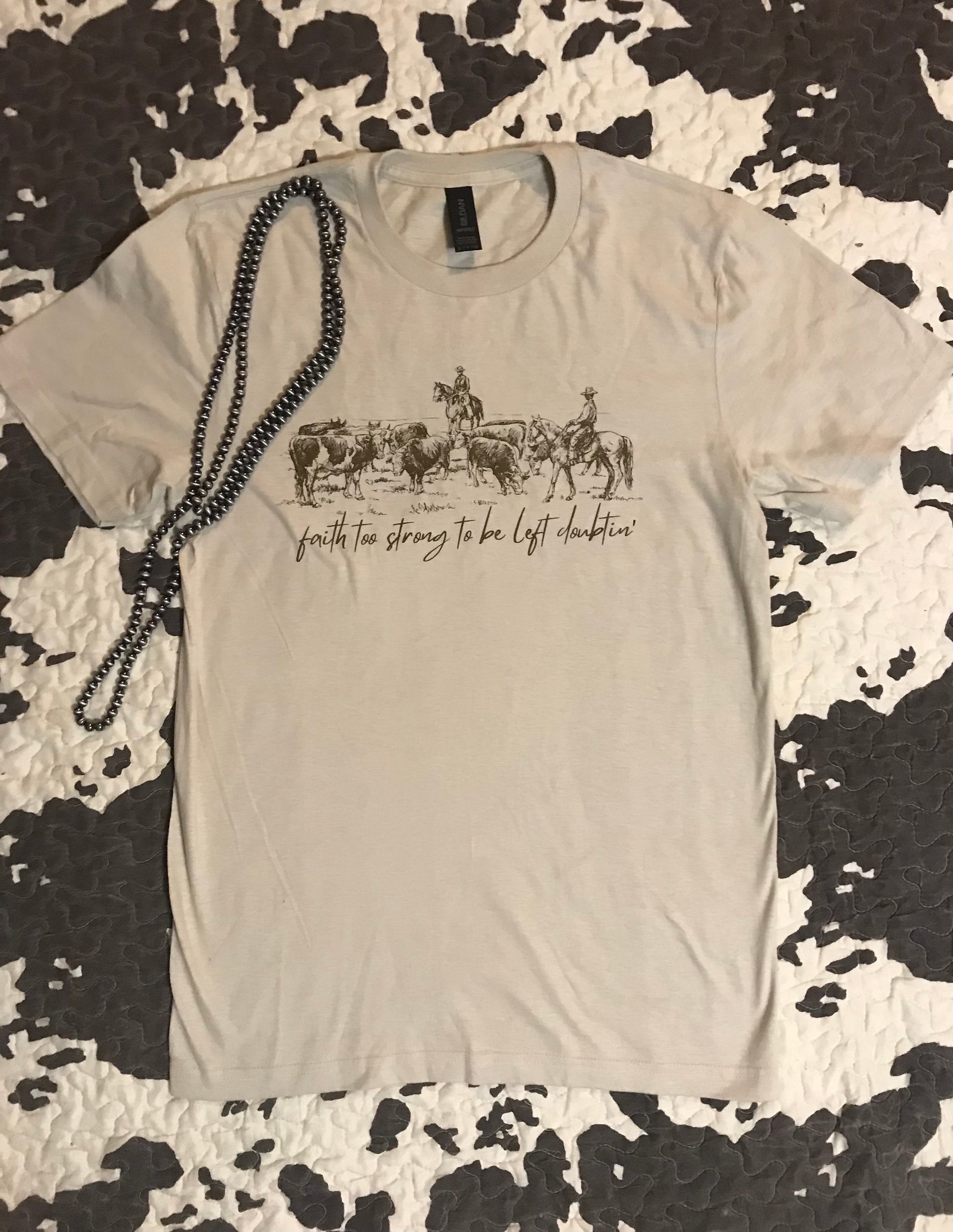 We are crazy about this shirt featuring the Tyler Childer’s lyric “Faith too strong to be left doubtin’!” The punchy Western graphic is the chef’s kiss! We love that you can share your faith and represent the cowboy way of life at the same time! This design can be printed on a sand colored Gildan brand T-shirt or a sweatshirt. You can choose long or short sleeve and crew neck or hoodie when ordering.