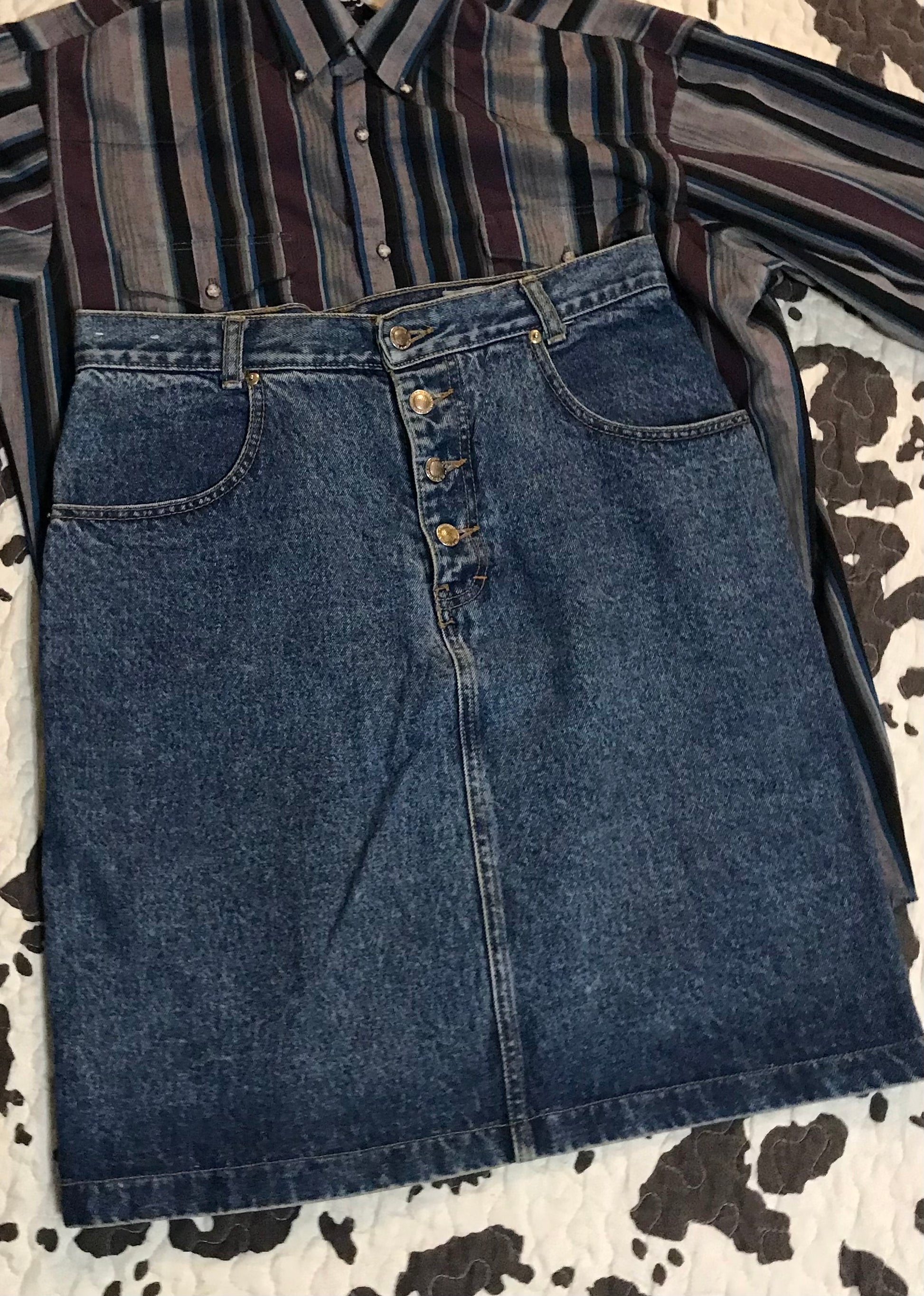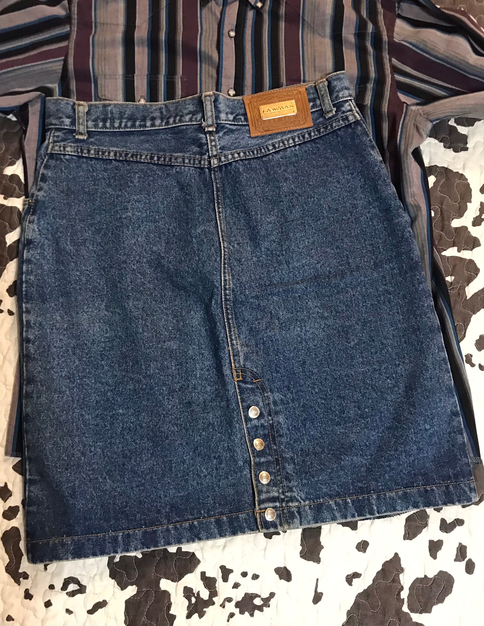 This vintage denim skirt is accented with the iconic Lawman buttons. The slit in the back can be unsnapped or left closed.