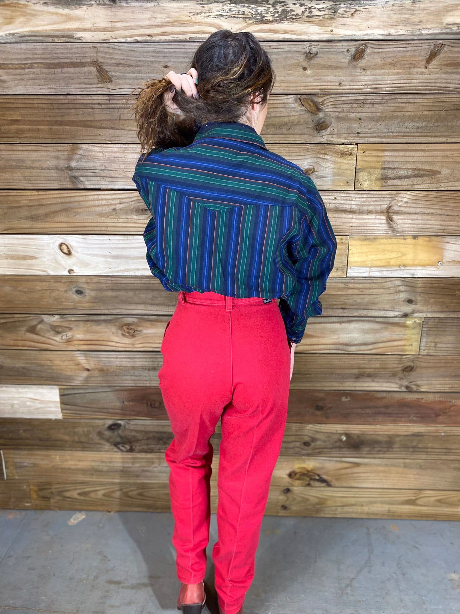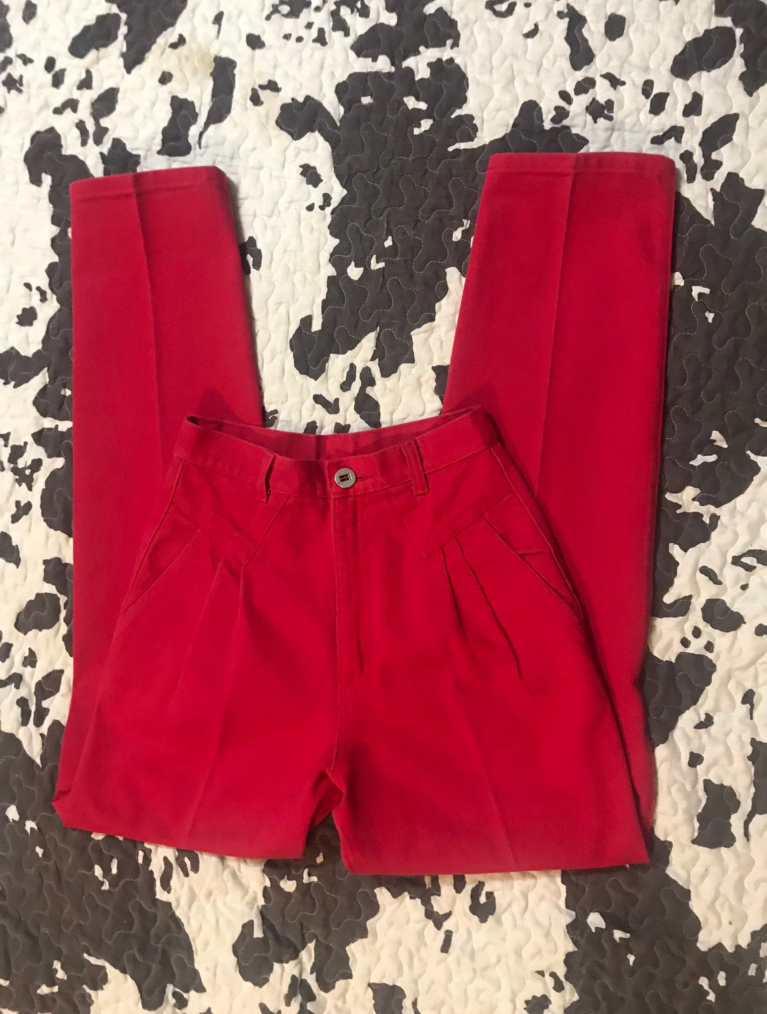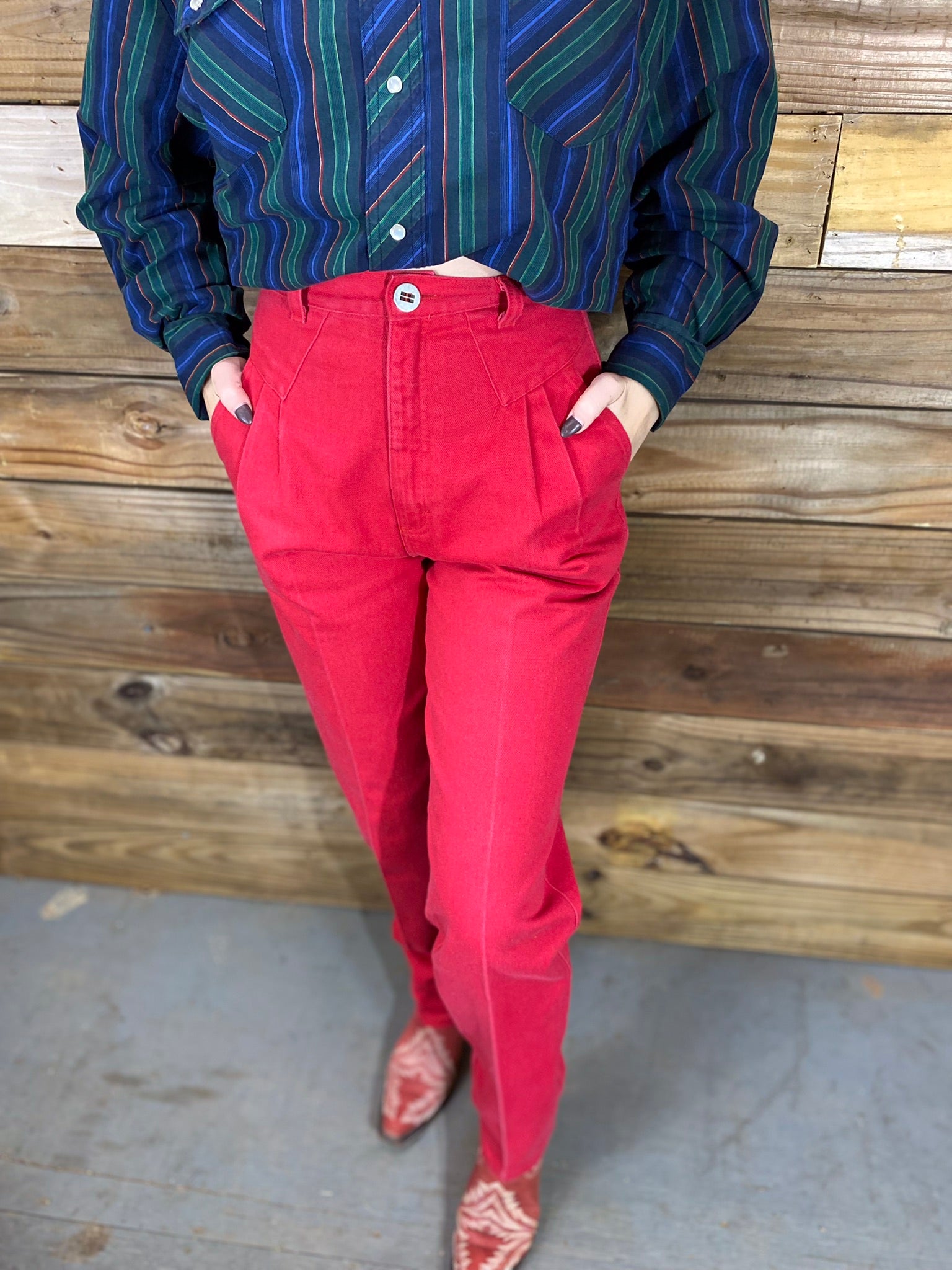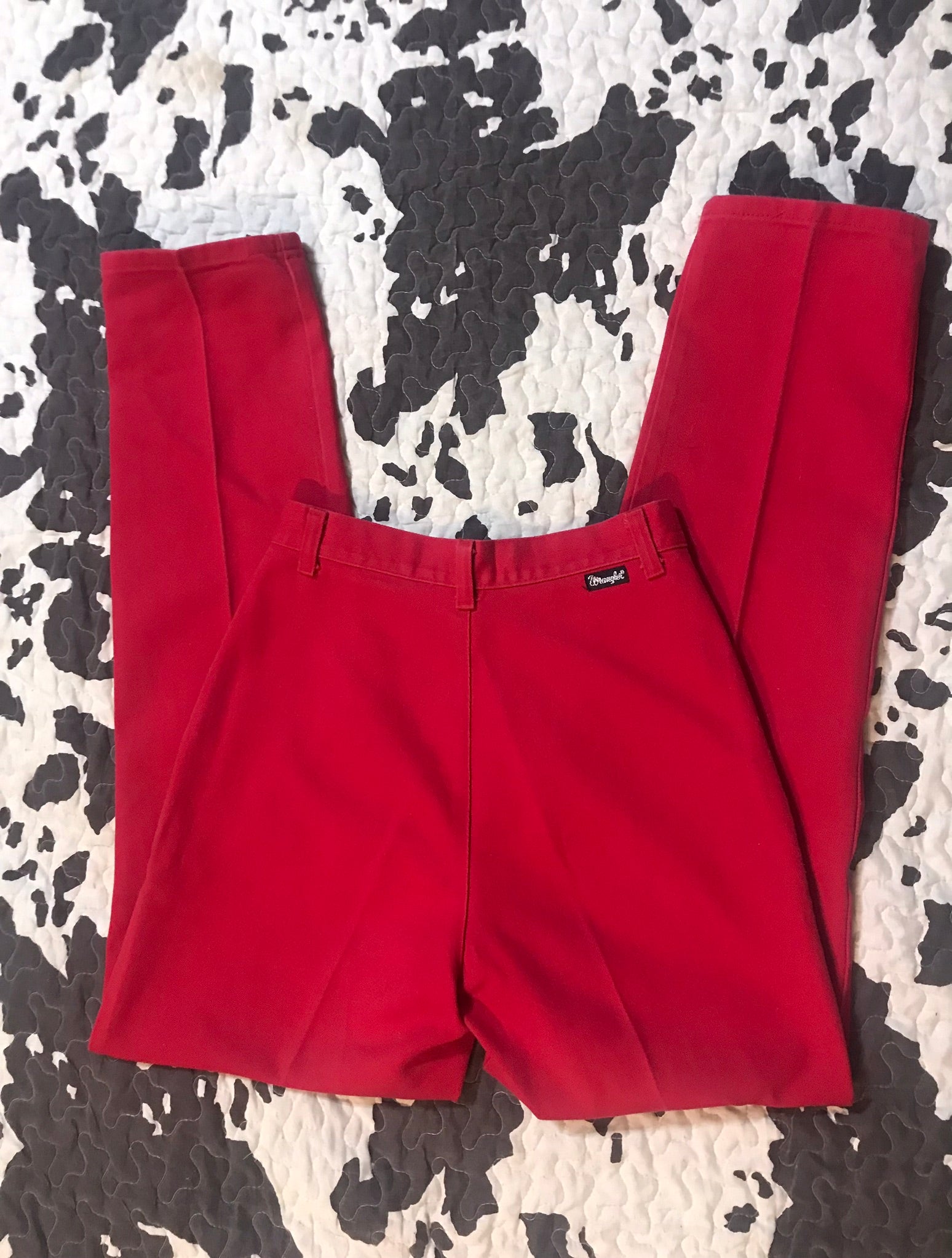We love the pleated front yoke on these beautiful red Wrangler jeans. The button has been replaced on them.