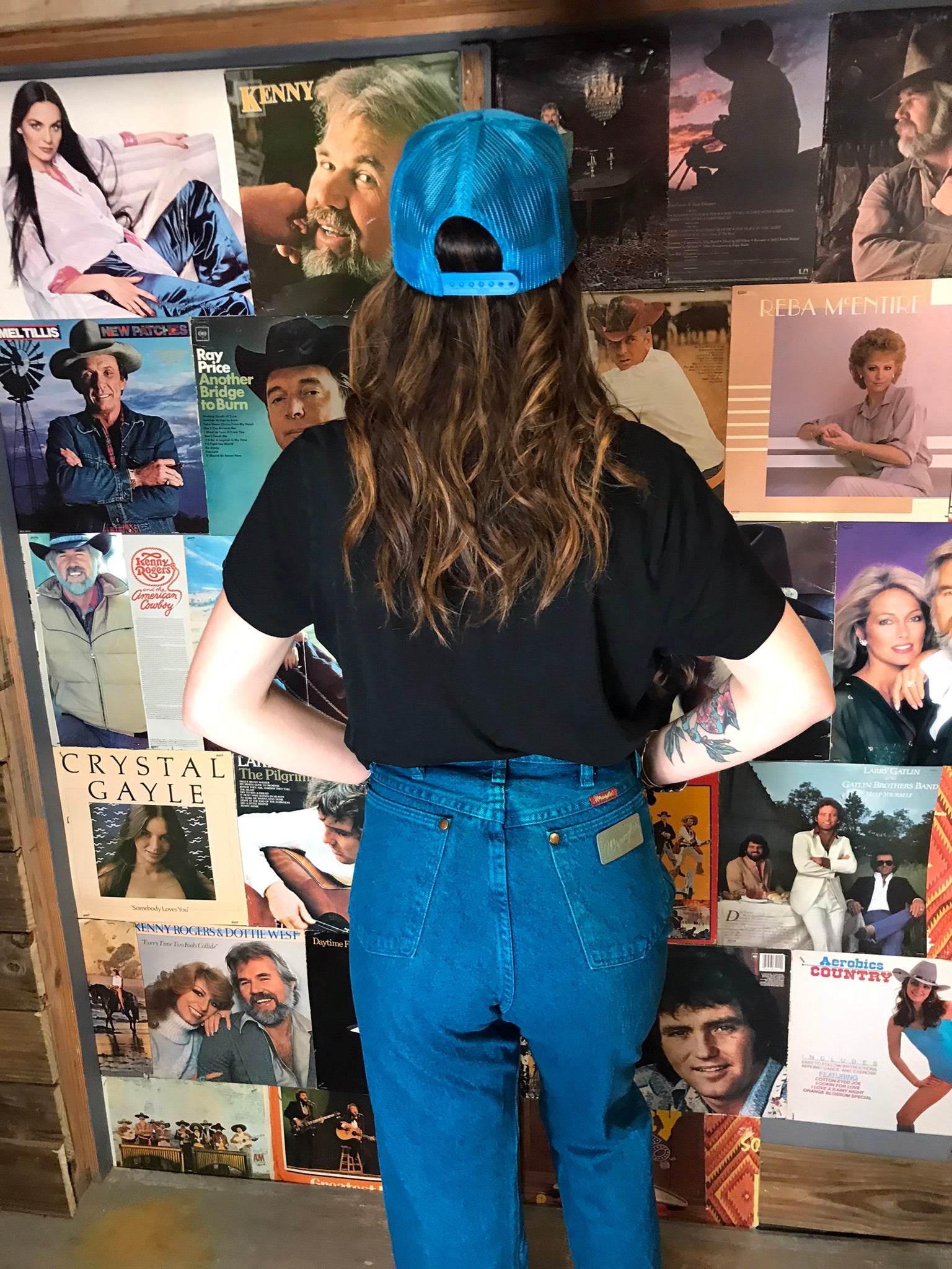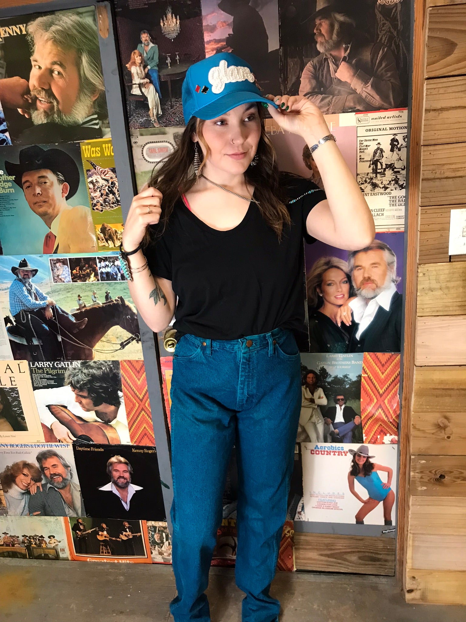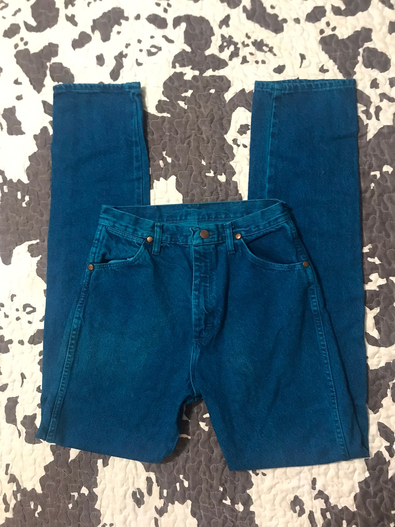 These stonewashed turquoise jeans have the classic leather Wrangler patch. Does it get any punchier?